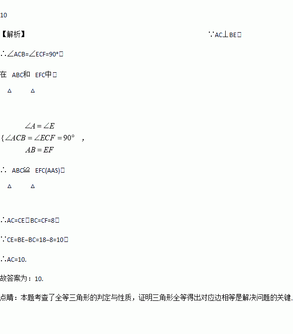 如图,∠A=∠E, AC⊥BE,AB=EF,BE=18,CF=8,则AC=________.