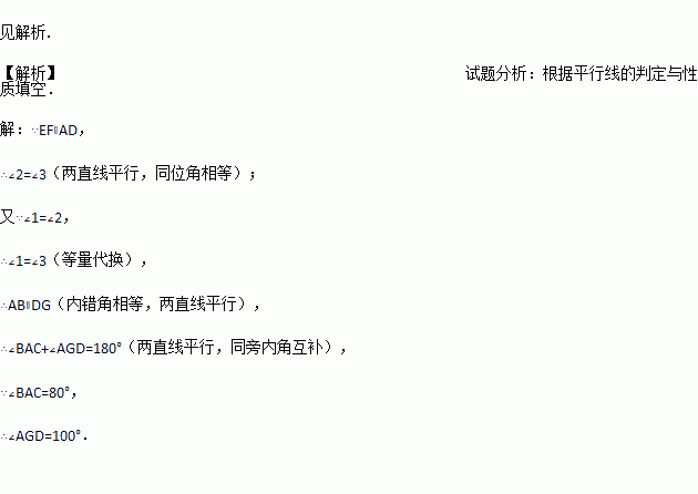 如图,EF∥AD,∠1=∠2,∠BAC=80°.将求∠AGD的过程填写完整.
