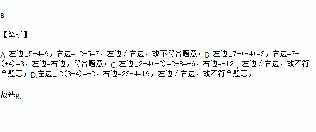 A. 5+4_______12-5 B. 7+(-4)______7-(+4) C. 2+4(-2)______-12 D. 2(3-4)_____23-4
