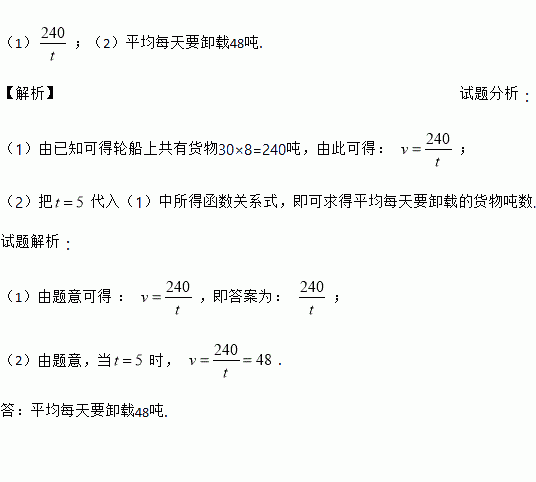 (1);(2)平均每天要卸载48吨. 【解析】试题分析: (1)由已知可得轮船上共有货物30×8=240吨,由此可得: ; (2)把代入(1)中所得函数关系式,即可求得平均每天要卸载的货物吨数. 试题解析: (1)由题意可得 : ,即答案为: ; (2)由题意,当时, . 答:平均每天要卸载48吨.