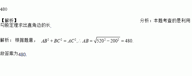 如图,某人欲横渡一条河,由于水流的影响,实际上岸地点C偏离欲到达点B200m,结果他在水中实际游了520m,求该河流的宽度为________m.