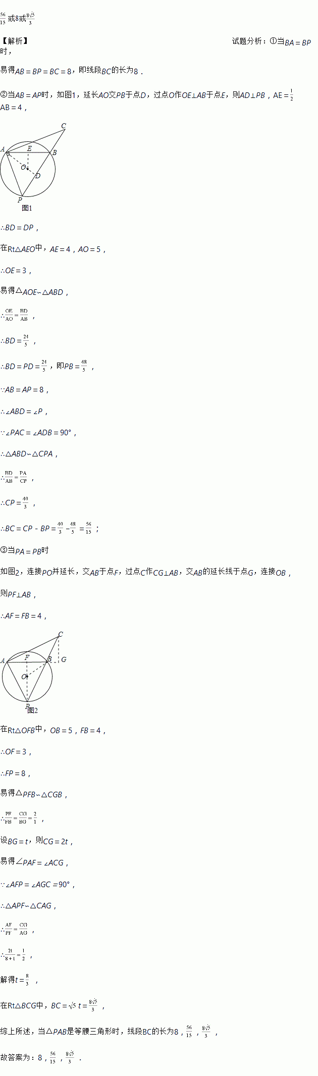 如图,在半径为 的 中,弦 , 是弦 所对的优弧上的动点,连接 , 过点 作 的垂线交射线 于点 ,当 是等腰三角形时,线段 的长为____.
