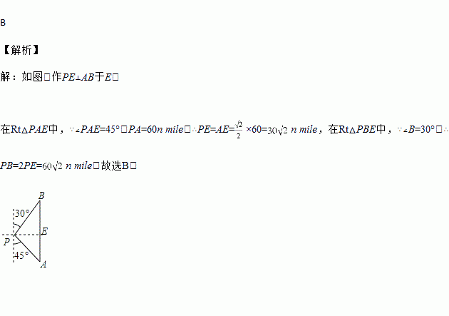 如图,一艘海轮位于灯塔P的南偏东45°方向,距离灯塔60n mile的A处,它沿正北方向航行一段时间后,到达位于灯塔P的北偏东30°方向上的B处,这时,B处与灯塔P的距离为( )