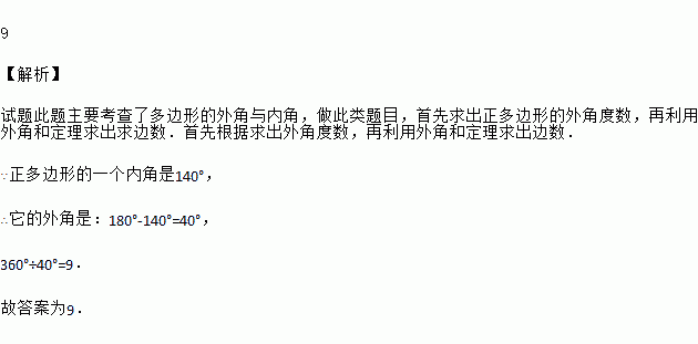 若正多边形的一个内角等于140°,则这个正多边形的边数是_______.