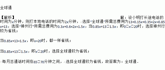 全球通 【解析】【解析】 设小明打长途电话的时间为x分钟,则打本地电话的时间为2x分钟,∴选择“全球通”所需总费用为13+0.15x+0.35×2x=0.85x+13,选择“神州行”所需总费用为0.3x+0.6×2x=1.5x,当0.85x+13>1.5x,即0<x<20时,选择神州行较为省钱; 当0.85x+13=1.5x,即x=20时,都一样省钱; 当0.85x+13<1....