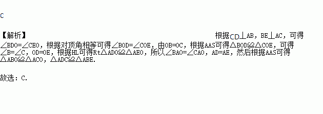 如图,CD丄AB于D,BE丄AC于E,BE与CD交于O,OB=OC ,则图中全等三角形共有( )
