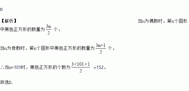 D 【解析】当n为偶数时,第n个图形中黑色正方形的数量为个, 当n为奇数时,第n个图形中黑色正方形的数量为个, ∴当n=101时,黑色正方形的个数为 =152, 故选D.