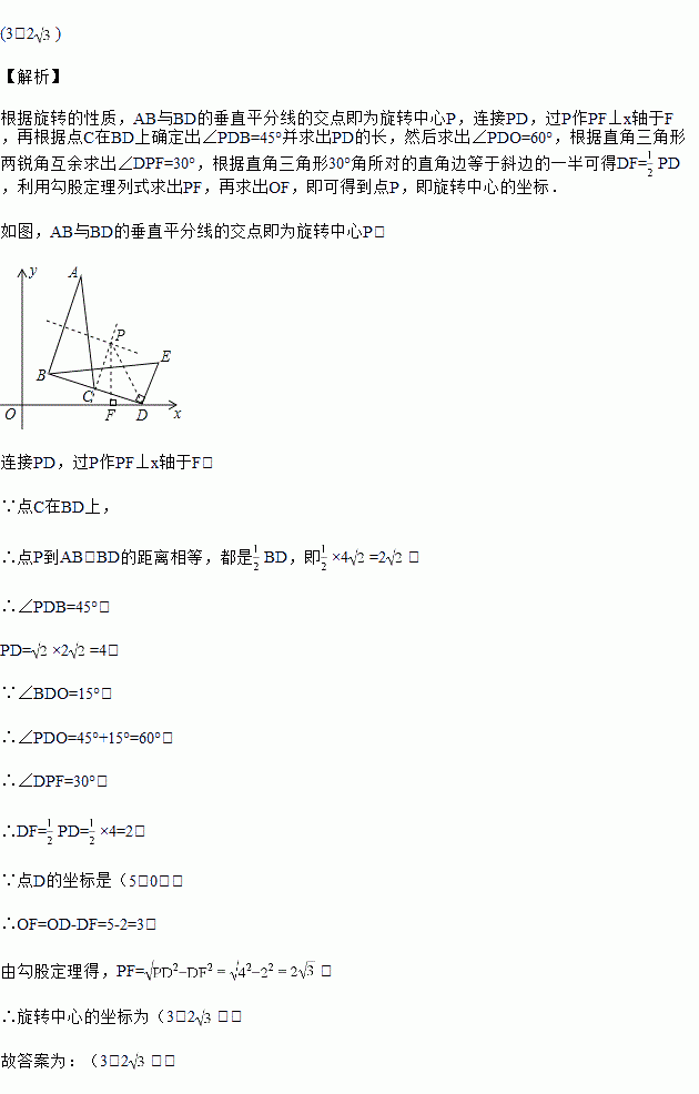 如图,在△BDE中,∠BDE=90°,BD=4,点D的坐标是(5,0),∠BDO=15°,将△BDE旋转到△ABC的位置,点C在BD 上,则旋转中心的坐标为_______ .