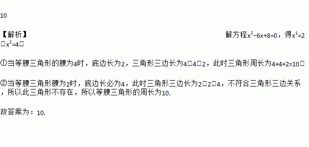 10 【解析】解方程x2?6x+8=0,得x1=2,x2=4, ①当等腰三角形的腰为4时,底边长为2,三角形三边长为4、4、2,此时三角形周长为4+4+2=10; ②当等腰三角形腰为2时,底边长必为4,此时三角形三边长为2、2、4,不符合三角形三边关系,所以此三角形不存在,所以等腰三角形的周长为10. 故答案为:10.当