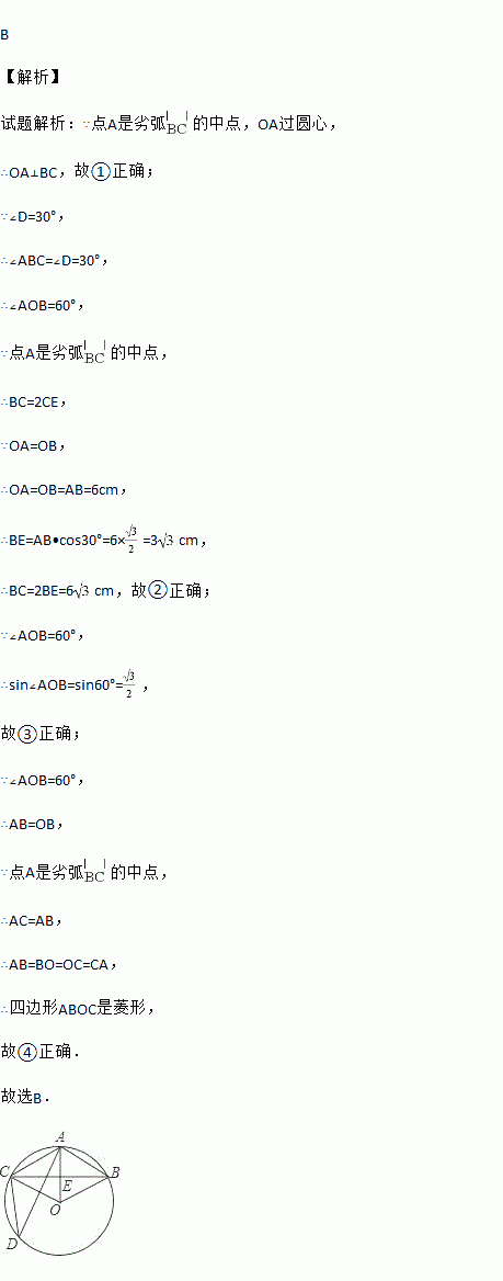 如图,在半径为6cm的⊙O中,点A是劣弧BC的中点,点D是优弧BC上一点,且∠D=30°,下列四个结论:①OA⊥BC;②BC=6