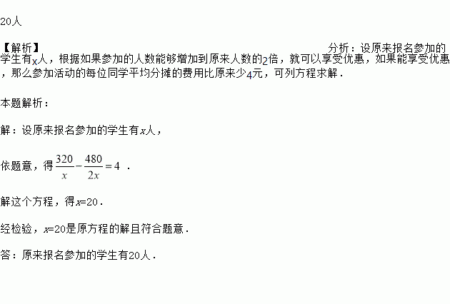 20ÈË ¡¾½âÎö¡¿·ÖÎö£ºÉèÔÀ´±¨Ãû²Î¼ÓµÄѧÉúÓÐxÈË£¬¸ù¾ÝÈç¹û²Î¼ÓµÄÈËÊýÄܹ»Ôö¼Óµ½ÔÀ´ÈËÊýµÄ2±¶£¬¾Í¿ÉÒÔÏíÊÜÓŻݣ¬Èç¹ûÄÜÏíÊÜÓŻݣ¬ÄÇô²Î¼Ó»î¶¯µÄÿλͬѧƽ¾ù·Ö̯µÄ·ÑÓñÈÔÀ´ÉÙ4Ôª£¬¿ÉÁз½³ÌÇó½â£® ±¾Ìâ½âÎö£º ¡¾½âÎö¡¿ ÉèÔÀ´±¨Ãû²Î¼ÓµÄѧÉúÓÐxÈË£¬ ÒÀÌâÒ⣬µÃ£® ½âÕâ¸ö·½³Ì£¬µÃx=20£® ¾¼ìÑ飬x=20ÊÇÔ·½³ÌµÄ½âÇÒ·ûºÏÌâÒ⣮ ´ð£ºÔÀ´±¨Ãû²Î¼ÓµÄѧÉúÓÐ20ÈË...