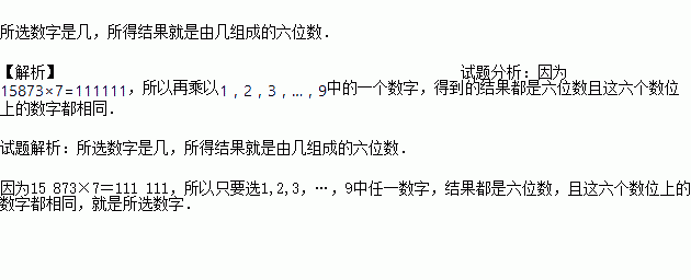 利用计算器探索规律,任选1,2,3,…,9中的一个数字,将这个数乘7,再将结果乘15 873,你发现了什么规律?你能试着解释一下原因吗?
