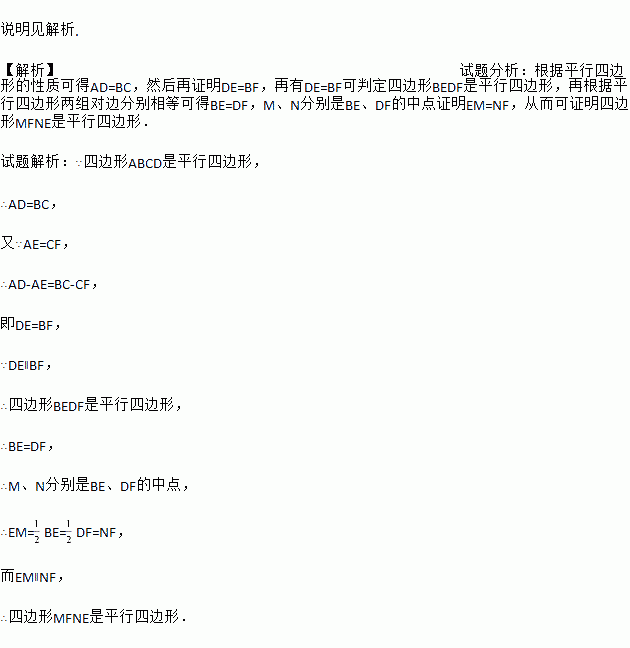 如图,在□ABCD中,AE=CF,M、N分别是BE、DF的中点,试说明四边形MFNE是平行四边形.