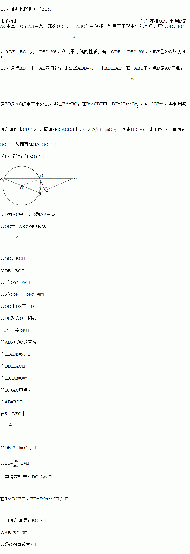 已知:如图,AB为⊙O的直径,⊙O过AC的中点D,DE⊥BC于点E.
