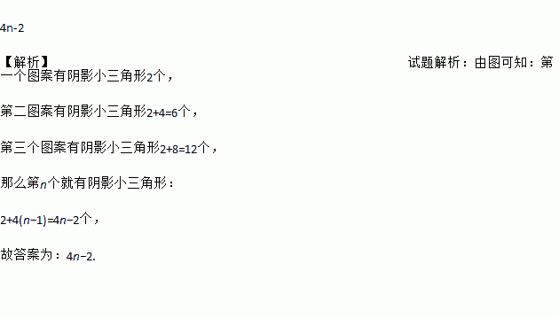 下图是由形状相同的六边形和三角形镶嵌而成的一组有规律的图案,则第n个图案中阴影小三角形的个数是______________(用含n的式子表示)。