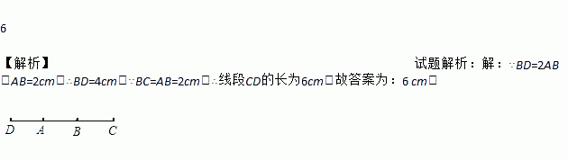 6 【解析】试题解析:【解析】 ∵BD=2AB,AB=2cm,∴BD=4cm,∵BC=AB=2cm,∴线段CD的长为6cm.故答案为:6 cm.