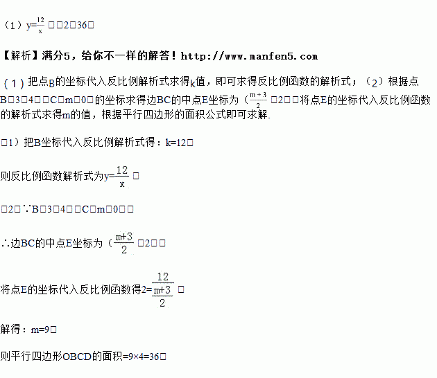 如图,已知平行四边形OBDC的对角线相交于点E,其中O(0,0),B(3,4),C(m,0),反比例函数y=