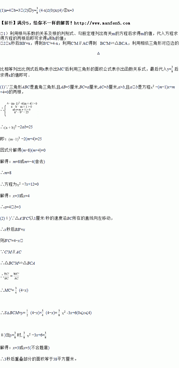 已知:如图在Rt△ABC中,斜边AB=5厘米,BC=厘米,AC=b厘米,![]()