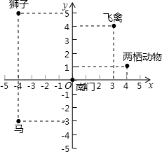 (2)各景点坐本标为:南门(0,0),飞禽(3,4),两栖动物(4,1),狮子(-4,5),马(-3,-3).