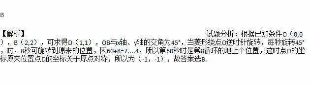 如图,已知菱形OABC的顶点O(0,0),B(2,2),若菱形绕点O逆时针旋转,每秒旋转45°,则 第60秒时,菱形的对角线交点D的坐标为