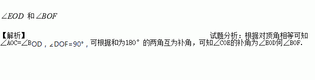 如图,直线与相交于, 与、与分别相交成直角.图中与互补的角是________.