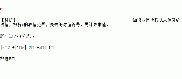 B 【解析】知识点是代数式求值及绝对值,根据a的取值范围,先去绝对值符号,再计算求值. 【解析】 当1<a<2时, |a﹣2|+|1﹣a|=2﹣a+a﹣1=1. 故选B.