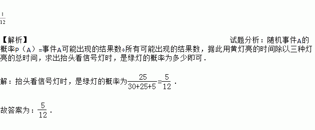 【解析】试题分析:随机事件A的概率P(A)=事件A可能出现的结果数÷所有可能出现的结果数,据此用黄灯亮的时间除以三种灯亮的总时间,求出抬头看信号灯时,是绿灯的概率为多少即可. 【解析】 抬头看信号灯时,是绿灯的概率为. 故答案为:.