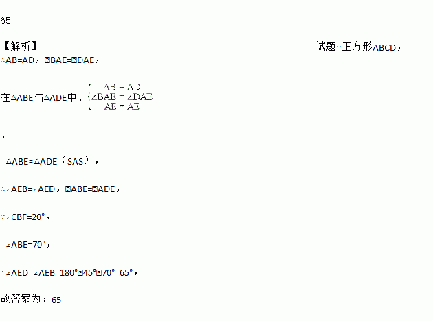如图,在正方形ABCD中,点F为CD上一点,BF与AC交于点E, 若∠CBF=20°,则∠AED等于__________度.