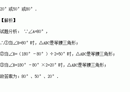 在△ABC中,∠A=80°,当∠B= 时, △ABC为等腰三角形.