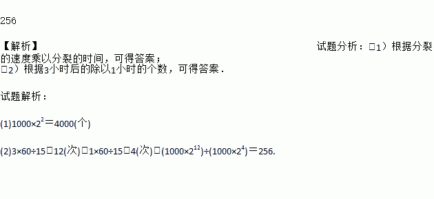 256 【解析】试题分析:(1)根据分裂的速度乘以分裂的时间,可得答案; (2)根据3小时后的除以1小时的个数,可得答案. 试题解析: (1)1000×22=4000(个) (2)3×60÷15=12(次),1×60÷15=4(次),(1000×212)÷(1000×24)=256.