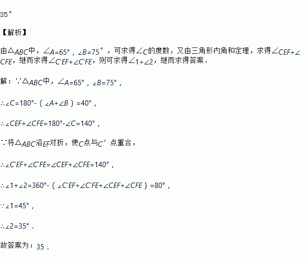 如图,△ABC中,∠A=65°,∠B=75°,将△ABC沿EF对折,使C点与C′点重合.当∠1=45°时,∠2=________°.