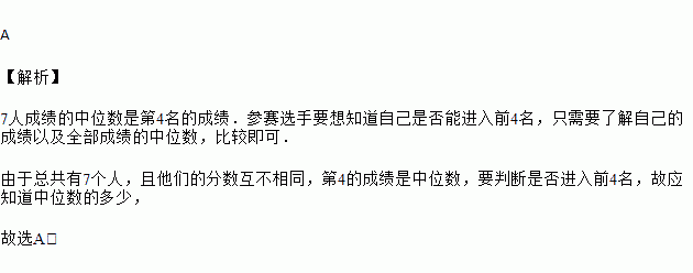 抚顺市中小学机器人科技大赛中,有7名学生参加决赛,他们决赛的成绩各不相同,其中一名参赛选手想知道自己能否进入前4名,他除了知道自己成绩外还要知道这7名学生成绩的( )