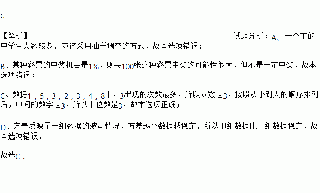 C 【解析】试题分析:A、一个市的中学生人数较多,应该采用抽样调查的方式,故本选项错误; B、某种彩票的中奖机会是1%,则买100张这种彩票中奖的可能性很大,但不是一定中奖,故本选项错误; C、数据1,5,3,2,3,4,8中,3出现的次数最多,所以众数是3,按照从小到大的顺序排列后,中间的数字是3,所以中位数是3,故本选项正确; D、方差反映了一组数据的波动情况,方差越小...