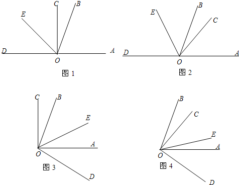 选择图1,根据余角与补角的定义分别求出∠BOC与∠BOD的度数,然后求出∠COD的度数,再根据角平分线的定义求出∠COE的度数,最后根据∠AOE=∠COE+∠BCO+∠AOB代入数据进行计算即可得解,其它图形根据相应的变化稍作变动即可.