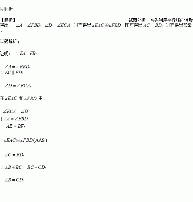 如图,点A、B、C、D在一条直线上,EA//FB,EC//FD,EA=FB. 求证:AB=CD.