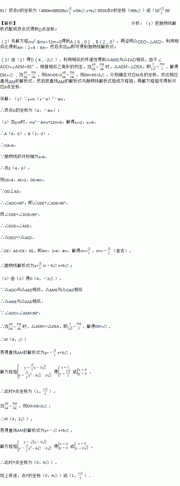 如图,抛物线y=mx2﹣8mx+12m(m>0)与x轴交于A,B两点(点B在点A的左侧),与y轴交于点C,顶点为D,其对称轴与x轴交于点E,联接AD,OD.