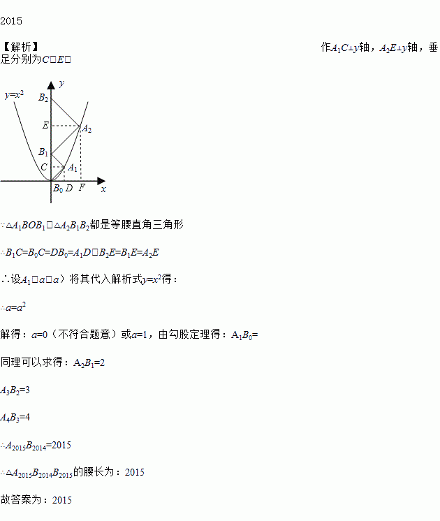 如图,点A1、A2、A3、…、An在抛物线y=x2图象上,点B1、B2、B3、…、Bn在y轴上,若△A1B0B1、△A2B1B2、…、△AnBn-1Bn都为等腰直角三角形(点B0是坐标原点),则△A2015B2014B2015的腰长=____