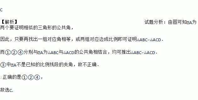 C 【解析】试题分析:由图可知∠A为两个要证明相似的三角形的公共角, 因此,只要再找出一组对应角相等,或两组对应边成比例即可证明△ABC∽△ACD. 而①②④分别与∠A为△ABC与△ACD的公共角相结合,均可推出△ABC∽△ACD. ③中∠A不是已知的比例线段的夹角,故不正确. ∴正确的是①②④, 故选C.