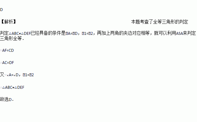 如图所示,已知∠A=∠D,∠1=∠2,那么要得到△ABC≌△DEF,还应给出的条件是( )