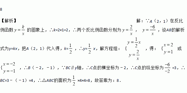 如图,过点O的直线AB与反比例函数y=的图象交于A,B两点,A(2,1),直线BC∥y轴,与反比例函数y=(x<0)的图象交于点C,连接AC,则△ABC的面积为_____.
