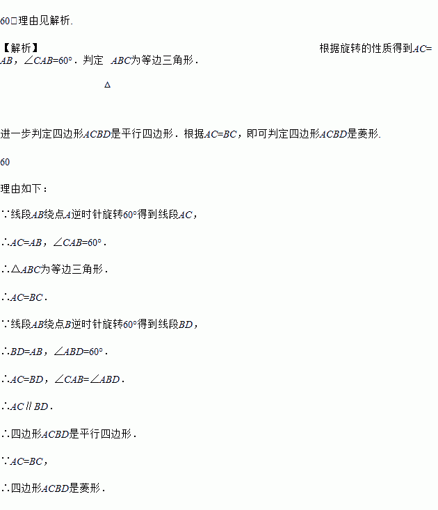 如图,将线段AB绕点A逆时针旋转α度角得到线段AC,将线段AB绕点B逆时针旋转α度角得到线段BD(0°<α<180°),连结BC、AD.当α=_______度时,四边形ACBD是菱形,并说明理由.