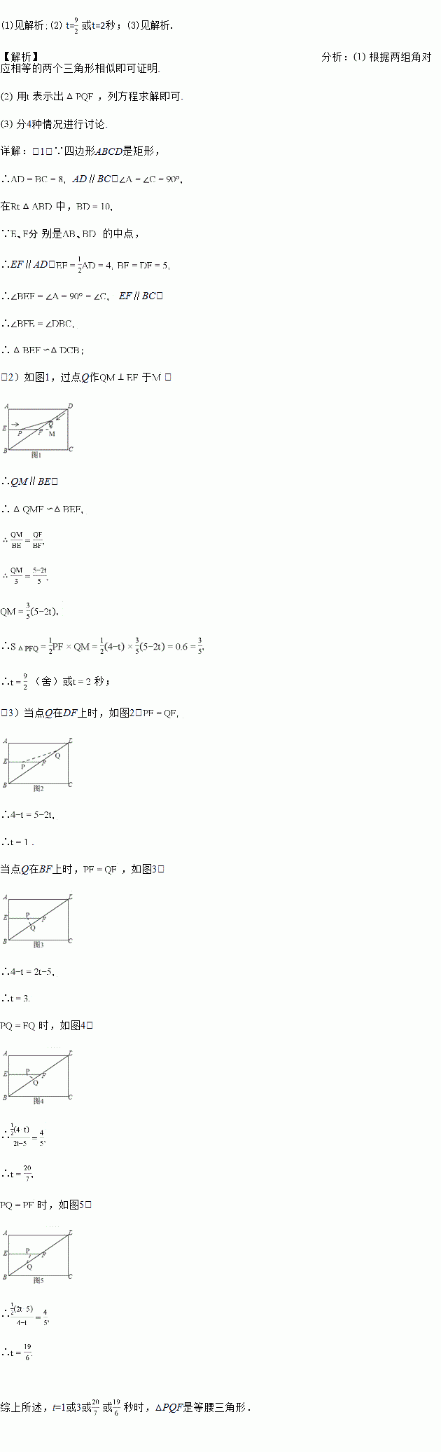 如图1,在矩形ABCD中,AB=6cm,BC=8cm,E、F分别是AB、BD的中点,连接EF,点P从点E出发,沿EF方向匀速运动,速度为1cm/s,同时,点Q从点D出发,沿DB方向匀速运动,速度为2cm/s,当点P停止运动时,点Q也停止运动.连接PQ,设运动时间为t(0<t<4)s,解答下列问题:
