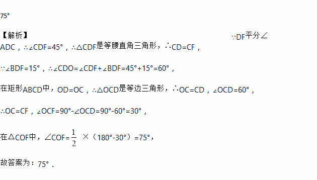 如图所示,O为矩形ABCD的对角线交点,DF平分∠ADC交AC于E,BC于F, ∠BDF=15°,则∠COF=______.