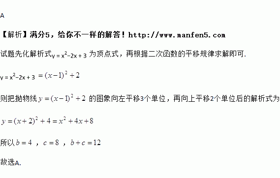 把抛物线y=x2+bx+c的图象向右平移3个单位,再向下平移2个单位,所得图象的解析式为y=x2-2x+3,则b+c=( ).
