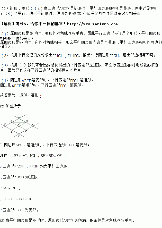 反之,当用上述方法所围成的平行四边形是矩形时,相应的原四边形必须满足怎样的条件?(直接写出结论)![]()