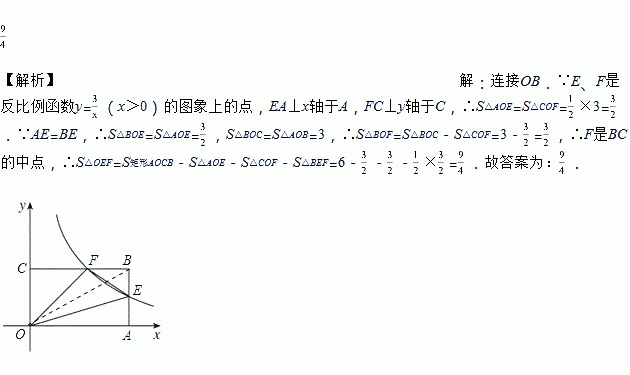 如图,反比例函数y=(x>0)的图像与矩形OABC的边AB、BC分别交于点E、F,且AE=BE,则△OEF的面积为____________。