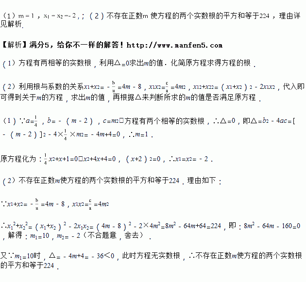 (2)是否存在正数m,使方程的两个实数根的平方和等于224.若存在,求出满足条件的m的值;若不存在,请说明理由.