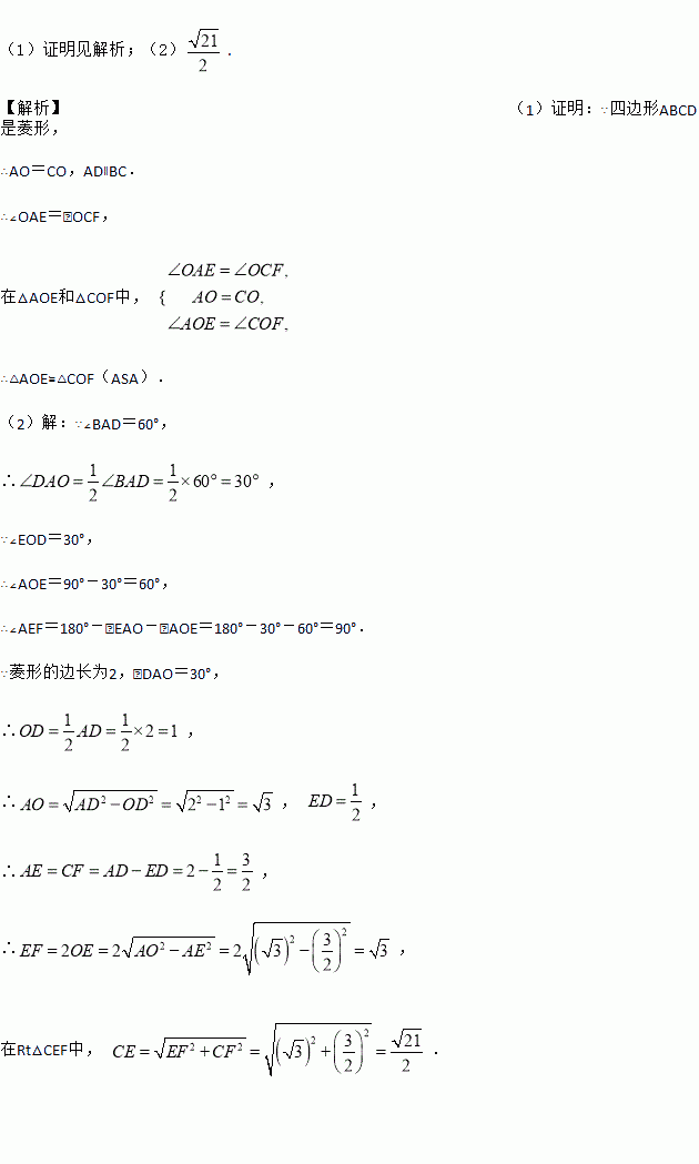 已知四边形ABCD是边长为2的菱形,∠BAD=60°,对角线AC与BD交于点O,过点O的直线EF交AD于点E,交BC于点F.