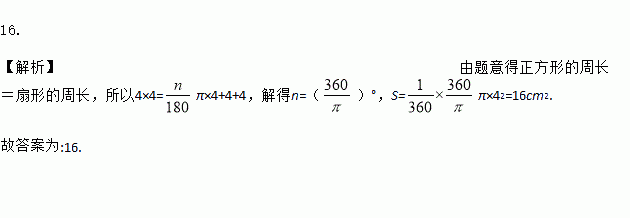 手工课上,小明将一个边长为4 cm的正方形铁丝框,变形成为如图所示的一个扇形框,周长不变,且扇形框半径等于正方形的边长,则该扇形的面积大小为 cm2.