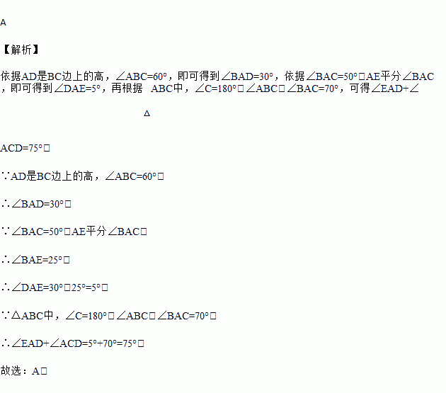 如图,△ABC中,AD是BC边上的高,AE、BF分别是∠BAC、∠ABC的平分线,∠BAC=50°,∠ABC=60°,则∠EAD+∠ACD=( )